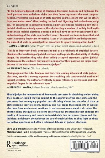 One of the most contentious issues in politics today is the propriety of electing judges. Ought judges be independent of democratic processes in obtaining and retaining their seats, or should they be subject to the approval of the electorate and the processes that accompany popular control? While this debate is interesting and often quite heated, it usually occurs without reference to empirical facts--or at least accurate ones. Also, empirical scholars to date have refused to take a position on the normative issues surrounding the practice. Bonneau and Hall offer a fresh new approach. Using almost two decades of data on state supreme court elections, Bonneau and Hall argue that opponents of judicial elections have made-and continue to make-erroneous empirical claims. They show that judicial elections are efficacious mechanisms that enhance the quality of democracy and create an inextricable link between citizens and the judiciary. In so doing, they pioneer the use of empirical data to shed light on these normative questions and offer a coherent defense of judicial elections. This provocative book is essential reading for anyone interested in the politics of judicial selection, law and politics, or the electoral process. Part of the Controversies in Electoral Democracy and Representation series edited by Matthew J. Streb.
