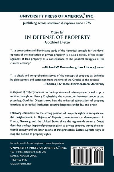 In Defense of Property focuses on the importance of private property and its protection throughout history. Emphasizing the connection between property and propriety, Gottfried Dietze shows how the universal appreciation of property functions as an ethical institution, securing happiness under law and order.