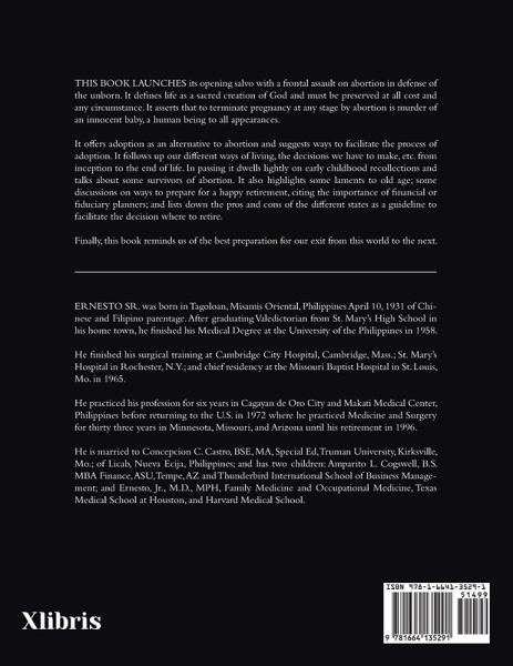 THIS BOOK LAUNCHES its opening salvo with a frontal assault on abortion in defense of the unborn. It defines life as a sacred creation of God and must be preserved at all cost and any circumstance. It asserts that to terminate pregnancy at any stage by abortion is murder of an innocent baby, a human being to all appearances. It offers adoption as an alternative to abortion and suggests ways to facilitate the process of adoption. It follows up our different ways of living, the decisions we have to make, etc. from inception to the end of life. In passing it dwells lightly on early childhood recollections and talks about some survivors of abortion. It also highlights some laments to old age; some discussions on ways to prepare for a happy retirement, citing the importance of financial or fiduciary planners; and lists down the pros and cons of the different states as a guideline to facilitate the decision where to retire. Finally, this book reminds us of the best preparation for our exit from this world to the next.