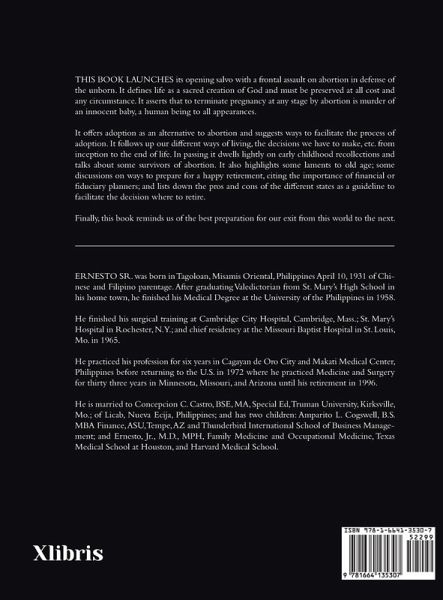THIS BOOK LAUNCHES its opening salvo with a frontal assault on abortion in defense of the unborn. It defines life as a sacred creation of God and must be preserved at all cost and any circumstance. It asserts that to terminate pregnancy at any stage by abortion is murder of an innocent baby, a human being to all appearances. It offers adoption as an alternative to abortion and suggests ways to facilitate the process of adoption. It follows up our different ways of living, the decisions we have to make, etc. from inception to the end of life. In passing it dwells lightly on early childhood recollections and talks about some survivors of abortion. It also highlights some laments to old age; some discussions on ways to prepare for a happy retirement, citing the importance of financial or fiduciary planners; and lists down the pros and cons of the different states as a guideline to facilitate the decision where to retire. Finally, this book reminds us of the best preparation for our exit from this world to the next.