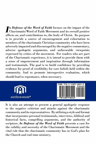 In Defense of the Word of Faith focuses on the impact of the Charismatic/Word of Faith Movement and its overall positive affects on, and contributions to, the body of Christ. Its purpose is to provide a source of encouragement and exhortation to members of the charismatic Christian community who have been adversely impacted and discouraged by the negative commentary, adverse apologetic arguments, and unfavorable viewpoints expressed by critics of the movement. For readers who are part of the Charismatic experience, it is intend to provide them with a sense of empowerment and inspiration through information and testimonials. The goal is to build confidence by providing evidence for proof of credibility for core beliefs held within the community. And to promote introspective evaluation, which should lead to repentance, when necessary. It is also an attempt to present a general apologetic response to the negative criticism and attacks against the charismatic community and its representatives. By utilizing a style and format that incorporates personal testimonials, interviews, biblical and historical facts, compelling arguments, and the authority of scripture, In Defense of the Word of Faith presents a case for the validity and necessity of the Charismatic Movement and the vital role that the charismatic community has in God's plan for the Church and end time ministry.