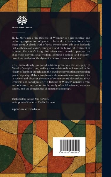H. L. Mencken's "In Defense of Women" is a provocative and enduring exploration of gender roles and the societal forces that shape them. A classic work of social commentary, this book fearlessly tackles themes of sexism, misogyny, and the historical treatment of women. Mencken's insightful, often controversial, perspective challenges conventional wisdom, offering a unique and thought-provoking analysis of the dynamics between men and women. This meticulously prepared edition preserves the integrity of Mencken's original text, making it accessible to those interested in the history of feminist thought and the ongoing conversation surrounding gender equality. Delve into a historical examination of women's roles in society and discover the roots of contemporary discussions about feminism and social justice. "In Defense of Women" remains a vital and relevant contribution to the study of social sciences, women's studies, and the complexities of human relationships. This work has been selected by scholars as being culturally important, and is part of the knowledge base of civilization as we know it. This work is in the public domain in the United States of America, and possibly other nations. Within the United States, you may freely copy and distribute this work, as no entity (individual or corporate) has a copyright on the body of the work. Scholars believe, and we concur, that this work is important enough to be preserved, reproduced, and made generally available to the public. We appreciate your support of the preservation process, and thank you for being an important part of keeping this knowledge alive and relevant.