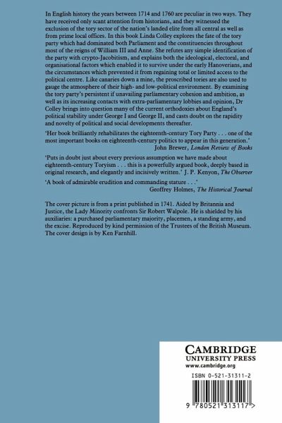 In English history the years between 1714 and 1760 are peculiar in two ways. They have received only scant attention from historians, and they witnessed the exclusion of the tory sector of the nation's landed elite from all central as well as from prime local offices. In this book Linda Colley explores the fate of the tory party which has dominated both Parliament and the constituencies throughout of the reigns of William III and Anne. She refutes any simple identification of the party with cryto-Jacobitism, and explains both the ideological, electoral, and organisational factors which enabled it to survive under the early Hanoverians, and the circumstances which prevented it from regaining total or limited access to the political centre. Like canaries down a mine, the proscribed tories are also used to gauge the atmosphere of their high-and low-political environment. By examining the tory party's persistent if unavailing parliamentary lobbies and opinion, Dr Colley brings into question many of the current orthodoxies about England's political stability under George I and George II, and casts doubt on the repidity and novelty of political and social developments thereafter.
