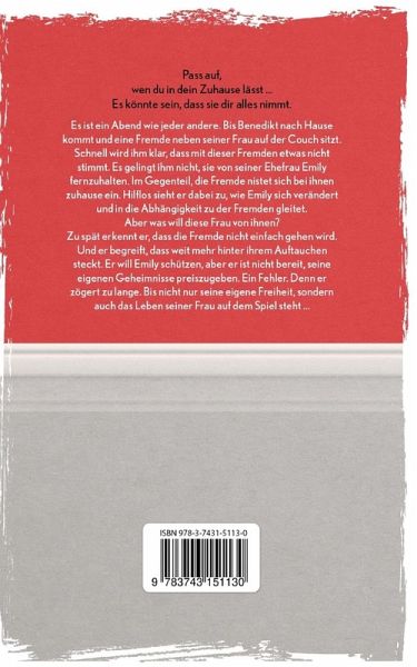 Pass auf, wen du in dein Zuhause lässt ...Es könnte sein, dass sie dir alles nimmt.Es ist ein Abend wie jeder andere. Bis Benedikt nach Hause kommt und eine Fremde neben seiner Frau auf der Couch sitzt. Schnell wird ihm klar, dass mit dieser Fremden etwas nicht stimmt. Es gelingt ihm nicht, sie von seiner Ehefrau Emily fernzuhalten. Im Gegenteil, die Fremde nistet sich bei ihnen zuhause ein. Hilflos sieht er dabei zu, wie Emily sich verändert und in die Abhängigkeit zu der Fremden gleitet.Aber was will diese Frau von ihnen?Zu spät erkennt er, dass die Fremde nicht einfach gehen wird. Und er begreift, dass weit mehr hinter ihrem Auftauchen steckt. Er will Emily schützen, aber er ist nicht bereit, seine eigenen Geheimnisse preiszugeben. Ein Fehler. Denn er zögert zu lange. Bis nicht nur seine eigene Freiheit, sondern auch das Leben seiner Frau auf dem Spiel steht ...