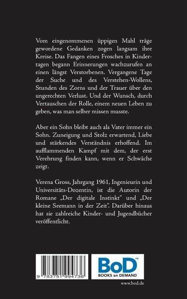Vom eingenommenen üppigen Mahl träge gewordene Gedanken zogen langsam ihre Kreise. Das Fangen eines Frosches in Kindertagen begann Erinnerungen wachzurufen an einen längst Verstorbenen. Vergangene Tage der Suche und des Verstehen-Wollens, Stunden des Zorns und der Trauer über den ungerechten Verlust. Und der Wunsch, durch Vertauschen der Rolle, einem neuen Leben zu geben, was man selber missen musste.Aber ein Sohn bleibt auch als Vater immer ein Sohn. Zuneigung und Stolz erwartend, Liebe und stärkendes Verständnis erhoffend. Im aufflammenden Kampf mit dem, der erst Verehrung finden kann, wenn er Schwäche zeigt.
