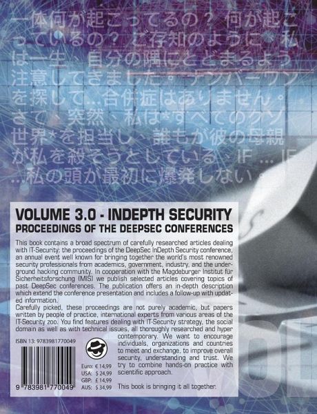 This book contains a broad spectrum of carefully researched articles dealing with IT-Security: the proceedings of the DeepSec InDepth Security conference, an annual event well known for bringing together the world's most renowned security professionals from academics, government, industry, and the underground hacking community. In cooperation with the Magdeburger Institut für Sicherheitsforschung (MIS) we publish selected articles covering topics of past DeepSec conferences. The publication offers an in-depth description which extend the conference presentation and includes a follow-up with updated information. Carefully picked, these proceedings are not purely academic, but papers written by people of practice, international experts from various areas of the IT-Security zoo. You find features dealing with IT-Security strategy, the social domain as well as with technical issues, all thoroughly researched and hyper contemporary. We want to encourage individuals, organizations and countries to meet and exchange, to improve overall security, understanding and trust. We try to combine hands-on practice with scientific approach. This book is bringing it all together.