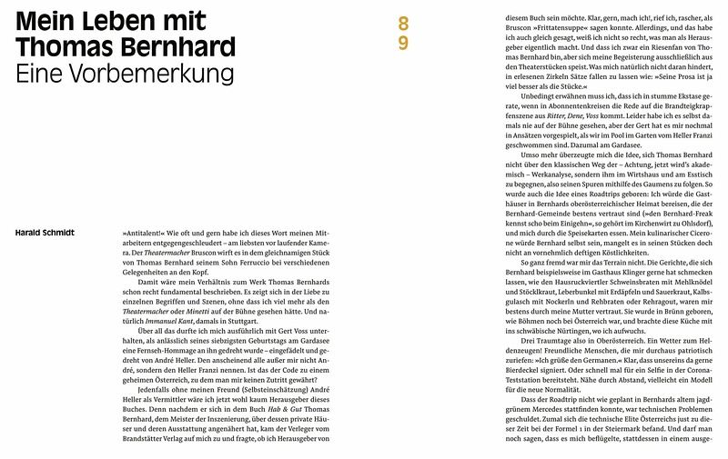 Ein gelungenes Buch, dass Einblicke in die Welt Thomas Bernhards offenbart. Harald Schmidt ist immer wieder ein Genuss.