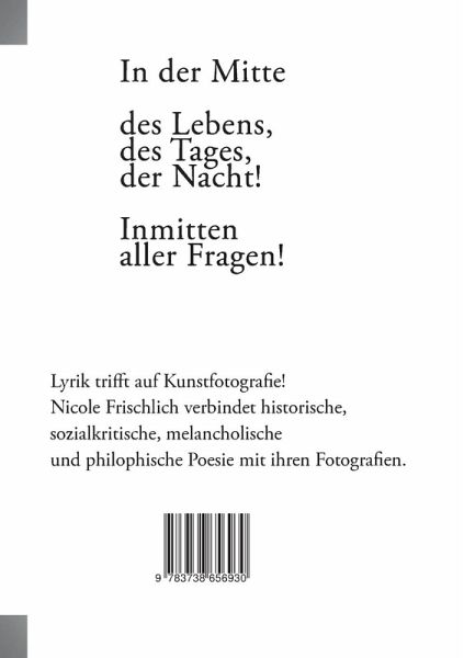 "In der Mitte" skizziert in ansprechend lyrischer Form tiefsinnige Themen, die gemeinsam mit der Fotografie eine Symbiose eingehen. Die Werke berichten aus der Historie, bedienen sich sozialkritischer Themen, sind behaftet mit Melancholie und oftmals philosophisch.