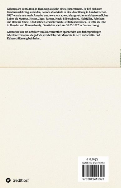 Geboren am 10.05.1816 in Hamburg als Sohn eines Bühnentenors. Er ließ sich zum Kaufmannslehrling ausbilden, danach absolvierte er eine Ausbildung in Landwirtschaft. 1837 wanderte er nach Amerika aus, wo er ein abwechslungsreiches und abenteuerliches Leben als Matrose, Heizer, Jäger, Farmer, Koch, Silberschmied, Holzfäller, Fabrikant und Hotelier führte. 1843 kehrte Gerstäcker nach Deutschland zurück. Er lebte ab 1868 in Dresden und Braunschweig. Gerstäcker starb am 31.05.1872 in Braunschweig.Gerstäcker war ein Erzähler von außerordentlich spannenden und farbenprächtigen Abenteuerromanen, die jedoch stets belehrende Momente in der Landschafts- und Kulturschilderung beinhalten.