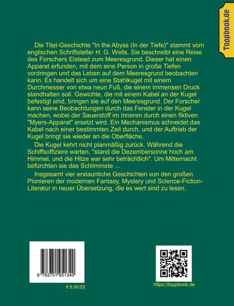 Die Titel-Geschichte "In the Abyss (In der Tiefe)" stammt vom englischen Schriftsteller H. G. Wells. Sie beschreibt eine Reise des Forschers Elstead zum Meeresgrund. Dieser hat einen Apparat erfunden, mit dem eine Person in große Tiefen vordringen und das Leben auf dem Meeresgrund beobachten kann. Es handelt sich um eine Stahlkugel mit einem Durchmesser von etwa neun Fuß, die einem immensen Druck standhalten soll. Gewichte, die mit einem Kabel an der Kugel befestigt sind, bringen sie auf den Meeresgrund. Der Forscher kann seine Beobachtungen durch das Fenster in der Kugel machen, wobei der Sauerstoff im Inneren durch einen fiktiven "Myers-Apparat" ersetzt wird. Ein Mechanismus schneidet das Kabel nach einer bestimmten Zeit durch, und der Auftrieb der Kugel bringt sie wieder an die Oberfläche.Die Kugel kehrt nicht planmäßig zurück. Während die Schiffsoffiziere warten, "stand die Dezembersonne hoch am Himmel, und die Hitze war sehr beträchtlich". Um Mitternacht befürchten sie das Schlimmste ...Insgesamt vier erstaunliche Geschichten von den großen Pionieren der modernen Fantasy, Mystery und Science-Fiction-Literatur in neuer Übersetzung, die es wert sind zu lesen.