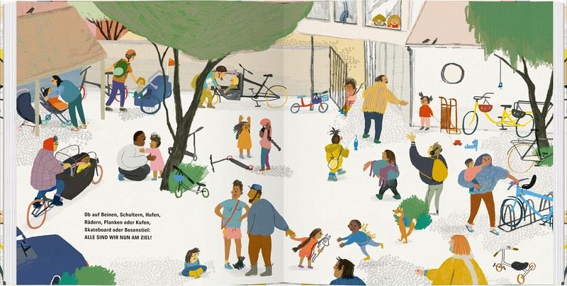 Morgens geht es los zur Kita - aber wie und womit? Im Kindersitz auf dem Fahrrad, zu Fuß oder im Kinderwagen? Im Fahrradanhänger ist es gemütlich, besonders zu zweit, man kann schon gemeinsam kichern. Auch Bus fahren ist toll, zusammen mit dem Lieblingskuscheltier und Opa. Während man zu Fuß in Ruhe alles unterwegs betrachten kann, saust so ein Roller wie der Wind durch die Stadt. Und selbst mit dem Schlitten oder per Boot kann man in die Kita gelangen. Das Beste: am Ende landen alle am Ziel und freuen sich auf die gemeinsame Zeit!Julia Dürr hat diesen rasanten Start in den Tag mit viel Witz und Liebe zum Detail in Szene gesetzt, Cornelia Boese erzählt dazu in schwungvollen Reimen.
