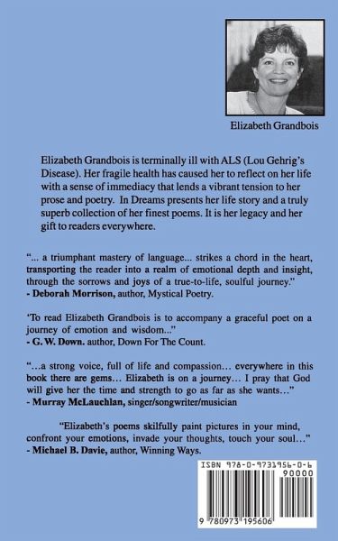 Elizabeth Grandbois is terminally ill with ALS (Lou Gehrig's Disease). Her fragile health caused her to reflect on her life with a sense of immediacy that lends a vibrant tensions to her prose and poetry. In Dreams presents her life story and a truly superb collection of her finest poems. It is her legacy and her gift to readers everywhere.