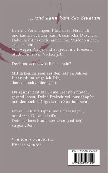 Der etwas andere Studienratgeber mit umfassenden Tipps zum Arbeiten im Homeoffice.Lernen, Vorlesungen, Klausuren, Haushalt und kaum noch Zeit zum Essen oder Duschen.Dabei heißt es doch immer, das Studentenleben sei so schön. Von wegen Partys und ausgedehnte Freizeit. Studieren ist ein Vollzeitjob. Doch muss das wirklich so sein?Mit Erkenntnissen aus den letzten Jahren Jurastudium zeige ich Dir, dass es auch anders geht.Du kannst Zeit für Deine Liebsten finden, gesund leben, Deine Freizeit genießen und dennoch erfolgreich im Studium sein. Freue Dich auf Tipps und Erfahrungen, mit denen Du es schaffst, Dein schönes Studentenleben (endlich) zu genießen.Von einer Studentin für Studenten