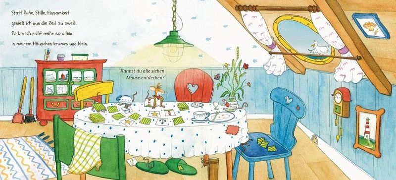 Der Text im Buch ist gereimt-ideal für die Sprachentwicklung- und kurz genug gehalten, dass Kleinkinder ab 2 Jahren ihre Aufmerksamkeit nicht verlieren. Neben der Geschichte sind auf allen Seiten kleine Fragen oder Mitmachaufgaben eingebaut(z.B. "Kannst fu alle sieben Mäuschen entdecken?"), die auch mein Sohn mit vier Jahren noch sehr gerne mitgemacht hat! Lustig finde ich, die Erzählsicht quasi aus den Augen des Häuschen Bewohners. Man bekommt richtig Lust auch in so einer krummen, kleinen Unterkunft zu leben!