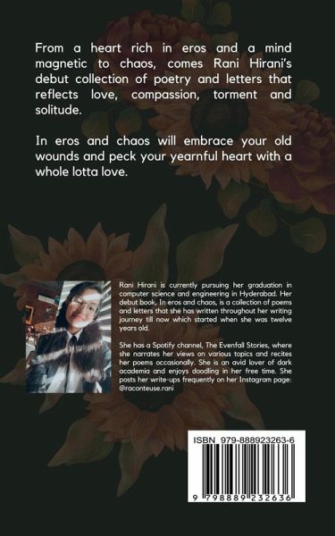 From a heart rich in eros and a mind magnetic to chaos, comes Rani Hirani's debut collection of poetry and letters that reflect love, compassion, torment, and solitude. In eros and chaos will embrace your old wounds and peck your yearnful heart with a whole lotta love.