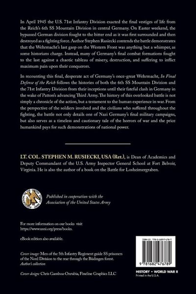In April 1945, the American 71st Infantry Division exacted the final vestiges of life from the Reich's 6th SS Mountain Division in central Germany. This analysis of the battle demonstrates that the Wehrmacht's last gasp on the Western Front was anything but a whimper as some historians charge. Instead, Stephen Rusiecki argues, the Nazis fought to exact every last bit of pain possible. The book follows the histories of both the German and American divisions from their inceptions until their fateful confrontation and serves as a testament to the human experience in war, from the perspective of the soldiers and the civilians who suffered the brunt of the fighting.
