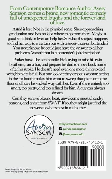 Can they survive blazing heat, unwelcome guests, handsy patrons, and a visit from SWAT? If so, they might just find the answers to what's next in each other. Astrid is lost. Not in the physical sense. She's approaching graduation and has no idea where to go from there. Maybe a good stiff drink or five can help her. So what if she just happens to find her way to a certain bar with a sexier-than-sin bartender? You never know, he could just have the answer to all of her problems. Wasn't that in a bartender's job description? Parker has all he can handle. He's trying to raise his twin brothers, run a bar, and prepare for his dad to move back home after his stroke. He doesn't need even one more thing to deal with; his plate is full. But one look at the gorgeous woman sitting in the far booth makes him want to sweep that plate onto the floor and have his wicked way with her. Even if she is entirely too smart, too pretty, and too refined for him. A guy can always dream.