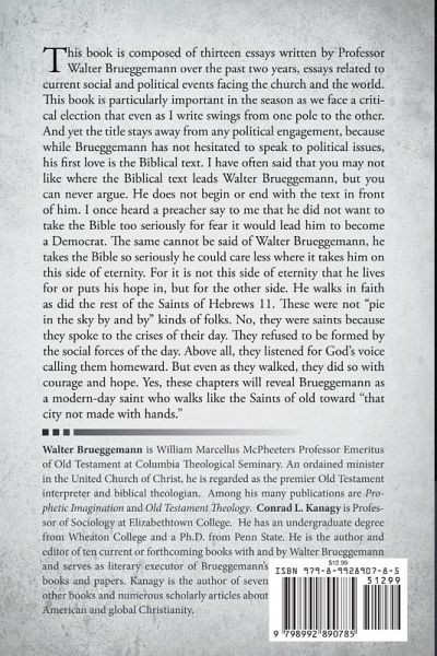 This stirring series of essays by Walter Brueggemann represents the inaugural book for the new imprint, Santos Books. Who better than Walter Brueggemann to inaugurate this imprint? Sinner? Undoubtedly. Saint? By God's grace alone. Walter once told me that progressives dislike him because he still believes in the old formula, that it is by grace alone that we are saved. And then he confided in me, "Conrad, I have to work to stay in that place of grace." And I love that old truth. Work to stay in the place of grace. For without the work there is but cheap grace. But without the grace, the work matters not. And it is ultimately expensive work. Each of these essays in this book poignantly speaks to the crisis of the current American church. Decades ago, sociologist Robert Bellah warned us of the development of civil religion in America. The merging of God and country. The legitimization of the country by God. The validation of war, violence, racism, abuse, and oppression in the name of Christ. While Donald Trump may represent one of the worst outcomes of this combination, he thrives on its existence, which has been a part of our country's history since its inception. As always, Brueggemann begins with the Bible and ends with the Bible. And if your allegiance is to anything other than the Bible, you will find him offensive. But if your heart has been softened by the sword that lays bare the intentions and motives of our souls, you will find in these essays great comfort.