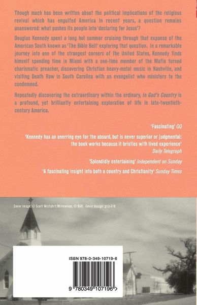 Though much has been written about the political implications of the religious revival which has engulfed America in recent years, a question remains unanswered: what pushes its people into 'declaring for Jesus'? Douglas Kennedy spent a long hot summer cruising through that expanse of the American South known as 'The Bible Belt' exploring that question. In a remarkable journey into one of the strangest corners of the United States, Kennedy finds himself spending time in Miami with a one-time member of the Mafia turned charismatic preacher, discovering Christian heavy metal music in Nashville, and visiting Death Row in South Carolina with an evangelist who ministers to the condemned. Repeatedly discovering the extraordinary within the ordinary, IN GOD'S COUNTRY is a profound, yet brilliantly entertaining exploration of life in late twentieth century America.