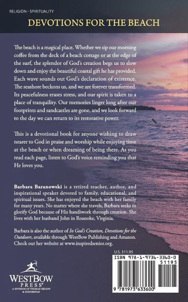 The beach is a magical place. Whether we sip our morning coffee from the deck of a beach cottage or at the edge of the surf, the splendor of Gods creation begs us to slow down and enjoy the beautiful coastal gift he has provided. Each wave sounds out Gods declaration of existence. The seashore beckons us, and we are forever transformed. Its peacefulness erases stress, and our spirit is taken to a place of tranquility. Our memories linger long after our footprints and sandcastles are gone, and we look forward to the day we can return to its restorative power. This is a devotional book for anyone wishing to draw nearer to God in praise and worship while enjoying time at the beach or when dreaming of being there. As you read each page, listen to Gods voice reminding you that He loves you.