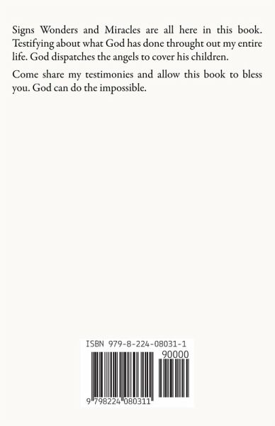 Signs Wonders and Miracles are all here in this book. Testifying about what God has done throught out my entire life. God dispatches the angels to cover his children. Come share my testimonies and allow this book to bless you. God can do the impossible.