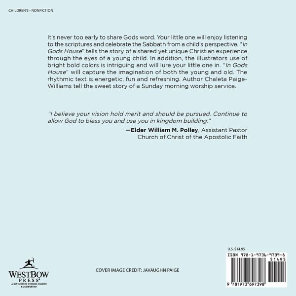 It's never too early to share Gods word. Your little one will enjoy listening to the scriptures and celebrate the Sabbath from a child's perspective. "In Gods House" tells the story of a shared yet unique Christian experience through the eyes of a young child. In addition, the illustrators use of bright bold colors is intriguing and will lure your little one in. "In Gods House" will capture the imagination of both the young and old. The rhythmic text is energetic, fun and refreshing. Author Chaleta Paige-Williams tell the sweet story of a Sunday morning worship service. "I believe your vision hold merit and should be pursued. Continue to allow God to bless you and use you in kingdom building." -Elder William M. Polley, Assistant Pastor Church of Christ of the Apostolic Faith