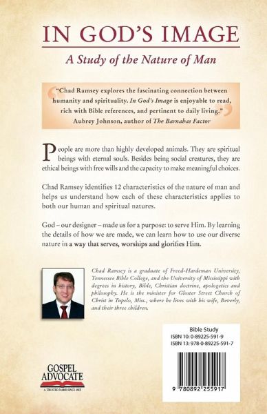 In God's Image - A Study of the Nature of Man People are more than highly developed animals. They are spiritual beings with eternal souls. Besides being social creatures, they are ethical beings with free wills and the capacity to make meaningful choices. Chad Ramsey identifies 12 characteristics of the nature of man and helps us understand how each of these characteristics applies to both our human and spiritual natures. God - our designer - made us for a purpose: to serve Him. By learning the details of how we are made, we can learn how to use our diverse nature in a way that serves, worships and glorifies Him.