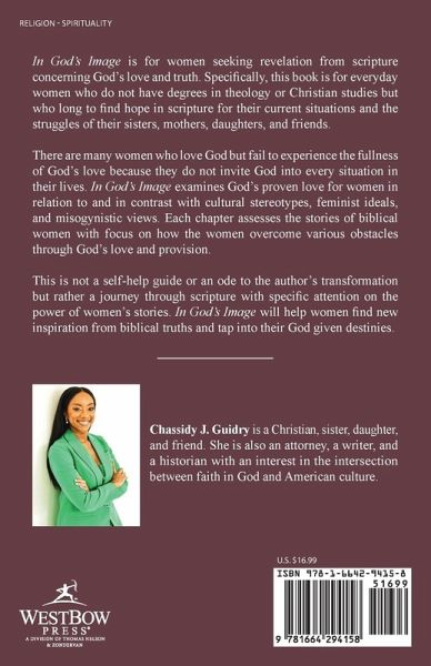 In God's Image is for women seeking revelation from scripture concerning God's love and truth. Specifically, this book is for everyday women who do not have degrees in theology or Christian studies but who long to find hope in scripture for their current situations and the struggles of their sisters, mothers, daughters, and friends. There are many women who love God but fail to experience the fullness of God's love because they do not invite God into every situation in their lives. In God's Image examines God's proven love for women in relation to and in contrast with cultural stereotypes, feminist ideals, and misogynistic views. Each chapter assesses the stories of biblical women with focus on how the women overcome various obstacles through God's love and provision. This is not a self-help guide or an ode to the author's transformation but rather a journey through scripture with specific attention on the power of women's stories. In God's Image will help women find new inspiration from biblical truths and tap into their God given destinies.