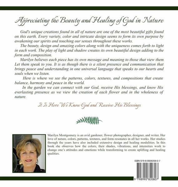 Marilyn Montgomery is an avid gardener, flower photographer, designer, and writer. Her love of nature, colors, patterns, textures, and form resonates in all her works. Her studies through the years have also included extensive design and healing modalities. In this book, she observes how the colors, their shades, vibrations, and intensities work to change one's attitudes and emotions while transforming to create uplifting and healing qualities.