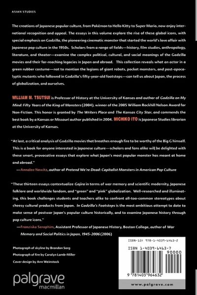 "At last, a critical analysis of Godzilla movies that breathes enough fire to be worthy of the Big G himself. This is a book for anyone interested in Japanese culture - scholars and fans alike will be delighted with these smart, provocative essays that explore what Japan's most popular monster has meant at home and abroad." - Annalee Newitz, author of Pretend We're Dead: Capitalist Monsters in American Pop Culture"These thirteen essays contextualize Gojira in terms of war memory and scientific modernity, Japanese folklore and worldwide fandom, and 'green' and 'pink' globalization. Well-researched and illuminating, this book challenges students and teachers alike to confront all-too-common stereotypes about cheesy cultural products from Japan. In Godzilla's Footsteps is the most ambitious attempt to date to make sense of postwar Japan's popular culture historically, and to examine Japanese history through pop culture icons." - Franziska Seraphim, Assistant Professor of Japanese History, Boston College, author of War Memory and Social Politics in Japan, 1945-2006 (2006) "In Godzilla's Footsteps is a fascinating look back at the early seeds of today's blossoming Japanese pop culture abroad." - Greenman Review