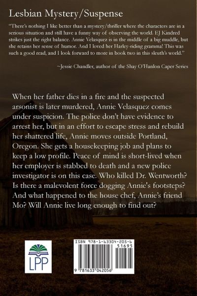 "In Harm's Way, by EJ Kindred, is a terrific read you won't want to put down. Nice pacing with funny, nostalgic, tragic scenes, twists, and surprises. The cast of characters is somewhat large, but I had no trouble keeping track of who was who, and I cared about what happened to them. In particular, I loved the realism of the average, every day people, the settings, and the jobs portrayed. The conflict was well-written between Downton Abbey upper crust nasty and Americana rural life with working people who care about each other. Highly recommended." ~Sue Hardesty, author of the Loni Wagner Mystery Series When her father dies in a fire and the suspected arsonist is later murdered, Annie Velasquez comes under suspicion. Though the police don't have evidence to arrest her, in an effort to escape stress and rebuild her shattered life, Annie moves south of Portland, Oregon, and gets a housekeeping job. Peace of mind is short-lived when her employer is stabbed to death and a new police investigator is on this case. Who killed Dr. Wentworth? Is there a malevolent force dogging Annie's footsteps? And what happened to the house chef, Annie's friend Mo? Will Annie live long enough to find out?