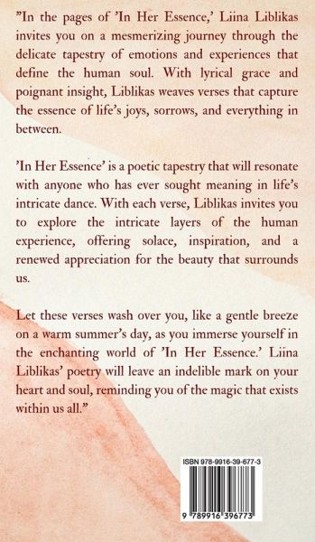 "In the pages of 'In Her Essence,' Liina Liblikas invites you on a mesmerizing journey through the delicate tapestry of emotions and experiences that define the human soul. With lyrical grace and poignant insight, Liblikas weaves verses that capture the essence of life's joys, sorrows, and everything in between.'In Her Essence' is a poetic tapestry that will resonate with anyone who has ever sought meaning in life's intricate dance. With each verse, Liblikas invites you to explore the intricate layers of the human experience, offering solace, inspiration, and a renewed appreciation for the beauty that surrounds us.Let these verses wash over you, like a gentle breeze on a warm summer's day, as you immerse yourself in the enchanting world of 'In Her Essence.' Liina Liblikas' poetry will leave an indelible mark on your heart and soul, reminding you of the magic that exists within us all." Copyright (c) 2024 Swan Charm Publishing