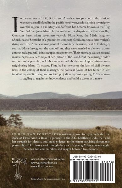 In the summer of 1859, British and American troops stood at the brink of war over a small island in the Pacific Northwest, each claiming sovereignty over the region in a military standoff that has become known as the "Pig War" of San Juan Island. In the midst of the dispute sat a Hudson's Bay Company farm, where seventeen year-old Flora Ross, the Métis daughter (Anishinaabe/Scottish) of a prominent company family, nursed a farmworker's dying wife. The American instigator of the military incursion, Paul K. Hubbs, Jr., courted Flora throughout the standoff, and they were married as the two nations announced a peaceful joint occupation agreement. Their marriage was celebrated in newspapers as a second joint occupation of the island. But the marriage didn't turn out to be peaceful, as Hubbs soon turned abusive and kept a mistress on a neighboring island. To escape, Flora had to overcome the lack of civil divorce laws in the colony of their marriage, the political power of her father-in-law in Washington Territory, and societal prejudices against a young Métis woman struggling to regain her independence and build a career as a nurse. In Her Own Footsteps is written in novel form, but tells the true story of Flora Amelia Ross-a pioneer in the B.C. healthcare industry-and her struggle for identity and independence, to the extent surviving documents permit. It is B.C. history told through the eyes of a young Métis woman caught between two communities, and caught between two nations.