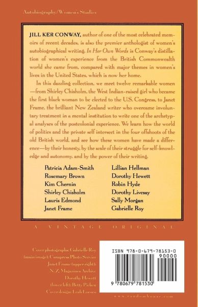 Jill Ker Conway, author of one of the most celebrated memoirs of recent decades, is also the premier anthologist of women's autobiographical writing. In Her Own Words is Conway's distillation of women's experience from the British Commonwealth world she came from, compared with major themes in women's lives in the United States, which is now her home. In this dazzling collection, we meet twelve remarkable women-from Shirley Chisholm, the West Indian-raised girl who became the first black woman to be elected to the U.S. Congress, to Janet Frame, the brilliant New Zealand writer who overcame involuntary treatment in a mental institution to write one of the archetypal analyses of the postcolonial experience. We learn how the world of politics and the private self intersect in the four offshoots of the old British world, and see how these women have made a difference-by their honesty, by the scale of their struggle for self-knowledge and autonomy, and by the power of their writing. Includes writing from: Patricia Adam-Smith Lillian Hellman Rosemary Brown Dorothy Hewett Kim Chernin Robin Hyde Shirley Chisholm Dorothy Livesay Lauris Edmond Sally Morgan Janet Frame Gabrielle Roy