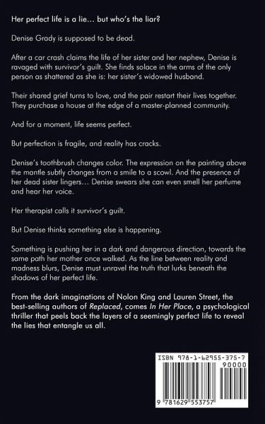 Her perfect life is a lie... but who's the liar? Denise Grady is supposed to be dead. After a car crash claims the life of her sister and her nephew, Denise is ravaged with survivor's guilt. She finds solace in the arms of the only person as shattered as she is: her sister's widowed husband. Their shared grief turns to love, and the pair restart their lives together. They purchase a house at the edge of a master-planned community. And for a moment, life seems perfect. But perfection is fragile, and reality has cracks. Denise's toothbrush changes color. The expression on the painting above the mantle subtly changes from a smile to a scowl. And the presence of her dead sister lingers... Denise swears she can even smell her perfume and hear her voice. Her therapist calls it survivor's guilt. But Denise thinks something else is happening. Something is pushing her in a dark and dangerous direction, towards the same path her mother once walked. As the line between reality and madness blurs, Denise must unravel the truth that lurks beneath the shadows of her perfect life. From the dark imaginations of Nolon King and Lauren Street, the best-selling authors of Replaced, comes In Her Place, a psychological thriller that peels back the layers of a seemingly perfect life to reveal the lies that entangle us all.