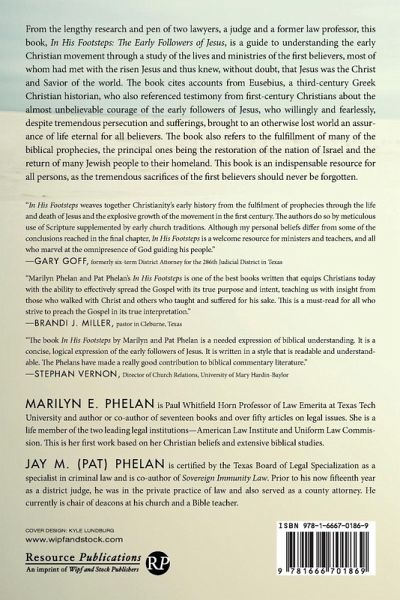 From the lengthy research and pen of two lawyers, a judge and a former law professor, this book, In His Footsteps: The Early Followers of Jesus, is a guide to understanding the early Christian movement through a study of the lives and ministries of the first believers, most of whom had met with the risen Jesus and thus knew, without doubt, that Jesus was the Christ and Savior of the world. The book cites accounts from Eusebius, a third-century Greek Christian historian, who also referenced testimony from first-century Christians about the almost unbelievable courage of the early followers of Jesus, who willingly and fearlessly, despite tremendous persecution and sufferings, brought to an otherwise lost world an assurance of life eternal for all believers. The book also refers to the fulfillment of many of the biblical prophecies, the principal ones being the restoration of the nation of Israel and the return of many Jewish people to their homeland. This book is an indispensable resource for all persons, as the tremendous sacrifices of the first believers should never be forgotten.