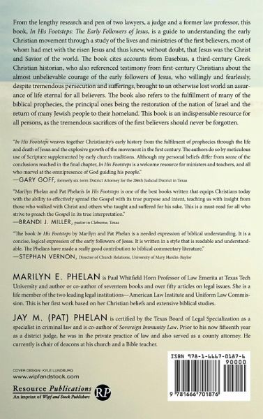 From the lengthy research and pen of two lawyers, a judge and a former law professor, this book, In His Footsteps: The Early Followers of Jesus, is a guide to understanding the early Christian movement through a study of the lives and ministries of the first believers, most of whom had met with the risen Jesus and thus knew, without doubt, that Jesus was the Christ and Savior of the world. The book cites accounts from Eusebius, a third-century Greek Christian historian, who also referenced testimony from first-century Christians about the almost unbelievable courage of the early followers of Jesus, who willingly and fearlessly, despite tremendous persecution and sufferings, brought to an otherwise lost world an assurance of life eternal for all believers. The book also refers to the fulfillment of many of the biblical prophecies, the principal ones being the restoration of the nation of Israel and the return of many Jewish people to their homeland. This book is an indispensable resource for all persons, as the tremendous sacrifices of the first believers should never be forgotten.