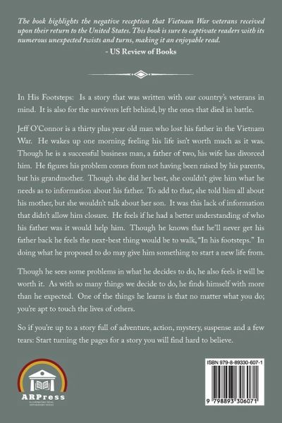 In His Footsteps: Is a story that was written with our country's veterans in mind. It is also for the survivors left behind, by the ones that died in battle. Jeff O'Connor is a thirty-plus-year-old man who lost his father in the Vietnam War. He wakes up one morning feeling his life isn't worth much as it was. Though he is a successful business man, a father of two, his wife has divorced him. He figures his problem comes from not having been raised by his parents, but his grandmother. Though she did her best, she couldn't give him what he needs as to information about his father. To add to that, she told him all about his mother, but she wouldn't talk about her son. It was this lack of information that didn't allow him closure. He feels if he had a better understanding of who his father was it would help him. Though he knows that he'll never get his father back he feels the next-best thing would be to walk, "In his footsteps." In doing what he proposed to do may give him something to start a new life from.Though he sees some problems in what he decides to do, he also feels it will be worth it. As with so many things we decide to do, he finds himself with more than he expected. One of the things he learns is that no matter what you do; you're apt to touch the lives of others.So if you're up to a story full of adventure, action, mystery, suspense and a few tears: Start turning the pages for a story you will find hard to believe.