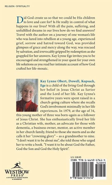 Did God create us so that we could be His children to love and care for? Is He really in control of what happens in our lives? With all the pain, suffering, and unfulfilled dreams in our lives how do we find answers? Travel with the author on a journey of one woman's life who was lured into rebellion at a young age, experienced grief, sorrow and hatred toward God, was provided glimpses of grace and mercy along the way, was rescued by salvation, and irrevocably gripped by redemption as she grappled for her answers. Kay Lynne Ege invites you to be encouraged and strengthened in your quest for your own life solutions as you read her intimate account of how God crafted her life-mosaic.