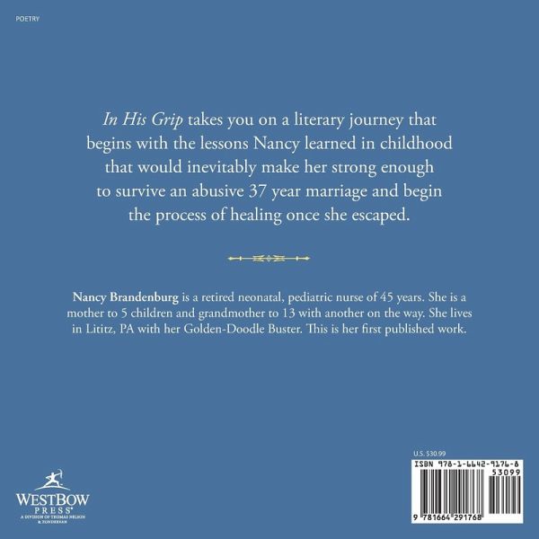 In His Grip is a testimony to the author's biblical counseling, written in poetry and prose. This book takes you on a literary journey that begins with the lessons Nancy learned in childhood that would inevitably make her strong enough to survive an abusive 37 year marriage and begin the process of healing once she escaped.