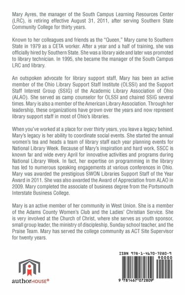 Mary Ayres, the manager of the South Campus Learning Resources Center (LRC), is retiring effective August 31, 2011, after serving Southern State Community College for thirty years. Known to her colleagues and friends as the "Queen," Mary came to Southern State in 1979 as a CETA worker. After a year and a half of training, she was officially hired by Southern State. She was a library aide and later was promoted to library technician. In 1995, she became the manager of the South Campus LRC and library. An outspoken advocate for library support staff, Mary has been an active member of the Ohio Library Support Staff Institute (OLSSI) and the Support Staff Interest Group (SSIG) of the Academic Library Association of Ohio (ALAO). She served as camp counselor for OLSSI and chaired SSIG several times. Mary is also a member of the American Library Association. Through her leadership, these organizations have grown over the years and now represent library support staff in most of Ohio's libraries. When you've worked at a place for over thirty years, you leave a legacy behind. Mary's legacy is her ability to coordinate social events. She started the annual women's tea and heads a team of library staff each year planning events for National Library Week. Because of Mary's inspiration and hard work, SSCC is known far and wide every April for innovative activities and programs during National Library Week. In fact, her expertise on programming in the library has led to numerous speaking engagements at various conferences in Ohio. Mary was awarded the prestigious SWON Libraries Support Staff of the Year Award in 2011. She was also awarded the Award of Appreciation from ALAO in 2009. Mary completed the associate of business degree from the Portsmouth Interstate Business College. Mary is an active member of her community in West Union. She is a member of the Adams County Women's Club and the Ladies' Christian Service. She is very involved at the Church of Christ, where she serves as youth sponsor, small group leader, the ministry of discipleship, Sunday school teacher, and the Praise Team. Mary has served the college community as ACT Site Supervisor for twenty years.