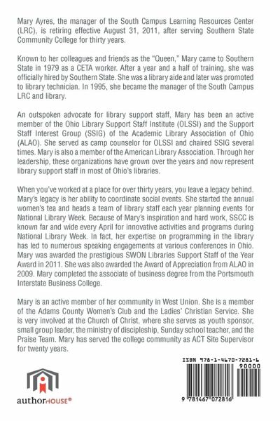 Mary Ayres, the manager of the South Campus Learning Resources Center (LRC), is retiring effective August 31, 2011, after serving Southern State Community College for thirty years. Known to her colleagues and friends as the "Queen," Mary came to Southern State in 1979 as a CETA worker. After a year and a half of training, she was officially hired by Southern State. She was a library aide and later was promoted to library technician. In 1995, she became the manager of the South Campus LRC and library. An outspoken advocate for library support staff, Mary has been an active member of the Ohio Library Support Staff Institute (OLSSI) and the Support Staff Interest Group (SSIG) of the Academic Library Association of Ohio (ALAO). She served as camp counselor for OLSSI and chaired SSIG several times. Mary is also a member of the American Library Association. Through her leadership, these organizations have grown over the years and now represent library support staff in most of Ohio's libraries. When you've worked at a place for over thirty years, you leave a legacy behind. Mary's legacy is her ability to coordinate social events. She started the annual women's tea and heads a team of library staff each year planning events for National Library Week. Because of Mary's inspiration and hard work, SSCC is known far and wide every April for innovative activities and programs during National Library Week. In fact, her expertise on programming in the library has led to numerous speaking engagements at various conferences in Ohio. Mary was awarded the prestigious SWON Libraries Support Staff of the Year Award in 2011. She was also awarded the Award of Appreciation from ALAO in 2009. Mary completed the associate of business degree from the Portsmouth Interstate Business College. Mary is an active member of her community in West Union. She is a member of the Adams County Women's Club and the Ladies' Christian Service. She is very involved at the Church of Christ, where she serves as youth sponsor, small group leader, the ministry of discipleship, Sunday school teacher, and the Praise Team. Mary has served the college community as ACT Site Supervisor for twenty years.