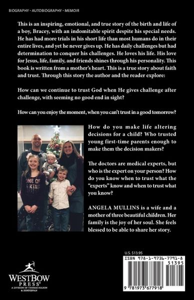 This is an inspiring, emotional, and true story of the birth and life of a boy, Bracey, with an indomitable spirit despite his special needs. He has had more trials in his short life than most humans do in their entire lives, and yet he never gives up. He has daily challenges but had determination to conquer his challenges. He loves his life. His love for Jesus, life, family, and friends shines through his personality. This book is written from a mother's heart. This is a true story about faith and trust. Through this story the author and the reader explore: How can we continue to trust God when He gives challenge after challenge, with seeming no good end in sight? How can you enjoy the moment, when you can't trust in a good tomorrow? How do you make life altering decisions for a child? Who trusted young first-time parents enough to make them the decision makers? The doctors are medical experts, but who is the expert on your person? How do you know when to trust what the "experts" know and when to trust what you know?