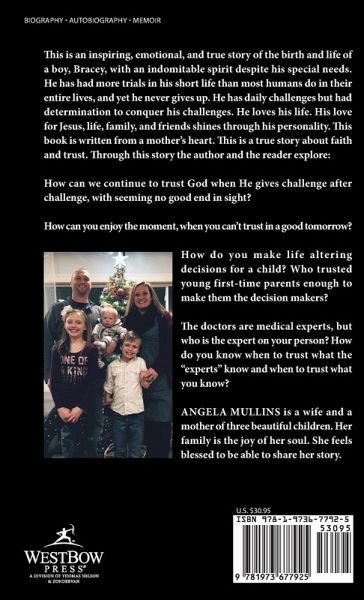 This is an inspiring, emotional, and true story of the birth and life of a boy, Bracey, with an indomitable spirit despite his special needs. He has had more trials in his short life than most humans do in their entire lives, and yet he never gives up. He has daily challenges but had determination to conquer his challenges. He loves his life. His love for Jesus, life, family, and friends shines through his personality. This book is written from a mother's heart. This is a true story about faith and trust. Through this story the author and the reader explore: How can we continue to trust God when He gives challenge after challenge, with seeming no good end in sight? How can you enjoy the moment, when you can't trust in a good tomorrow? How do you make life altering decisions for a child? Who trusted young first-time parents enough to make them the decision makers? The doctors are medical experts, but who is the expert on your person? How do you know when to trust what the "experts" know and when to trust what you know?