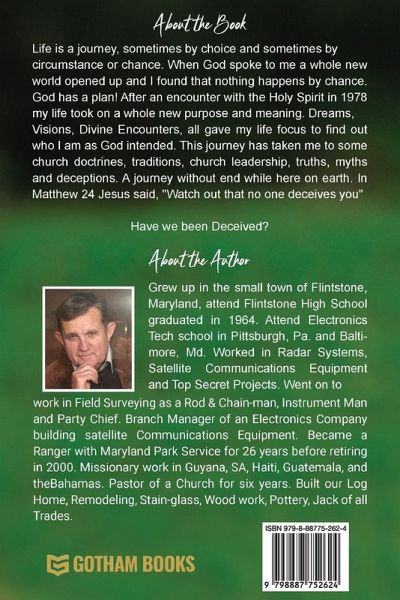 Life is a journey, sometimes by choice and sometimes by circumstance or chance. When God spoke to me a whole new world opened up and I found that nothing happens by chance. God has a plan! After an encounter with the Holy Spirit in 1978 my life took on a whole new purpose and meaning. Dreams, Visions, Divine Encounters, all gave my life focus to find out who I am as God intended. This journey has take me to some church doctrines, traditions, church leadership, truths, myths, and deceptions. A journey without end while here on earth. In Matthew 24 Jesus said, "Watch out that no one deceives you"