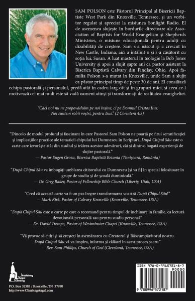 What people are saying about In His Image… "In the writing of In His Image, Pastor Polson not only does a wonderful job showing us what it means to be made in the image of God, but he also provides us with very practical steps that will help us in this transformation process. I think you will find this book to be a positive step in seeing God transform you into His image!" -- Mark Kirk, Pastor of Calvary Knoxville (Knoxville, Tennessee) "In a culture awash with self-identity talk, Pastor Sam Polson directs us to the truest identity of all - our Creator and Redeemer, the Lord Jesus Christ Himself. By successfully combining insightful theology and pastoral warmth, In His Image will enrich the reader's walk with God. I can see this book being particularly helpful for any Sunday school class, small group meeting, or in-home Bible study." -- Dr. Greg Baker, Pastor of Fellowship Bible Church (Liberty, Utah) "Coram Deo is a Latin phrase translated in the presence of God, and defines how my friend Sam Polson submits to Christ and His kingdom. In this book, Pastor Sam provides a fresh and stimulating insight into the beautiful, biblical doctrine of Imago Dei, the image of God, while giving the reader the tools needed to REAP the word. In His Image is a book I highly recommend to assist in family worship, private devotion, or personal study." -- Dr. David Trempe, Pastor of Westminster Chapel (Knoxville, Tennessee) "In the book In His Image, Sam Polson carries the reader on a journey that challenges us to realize our destiny and purpose for life. As "iron sharpeneth iron" we find ways to appreciate and respect God's image in others through the mirror of the Word. Pastor Polson also challenges us to realize how the enemy desires to mar Christ's image in our quest to reveal Him to the world. I challenge you to read and grow into the likeness of our Creator and Redeemer. In His Image will inspire, educate, and guide you in that sacred process." -- Rev. Sam Phillips, Church of God (Cleveland, Tennessee) "Beyond the profound and fascinating way in which Pastor Sam Polson takes us along the thread of the significance and practical implications of the theme of God's image in Scripture, In His Image is a book that springs as much from the study and living out of those truths, as from a rich experience of pastoral service. The book awakens us to a simple truth, old but always relevant, that the purpose and passion of God is seeing humans transformed in His image, an image fully revealed in Christ. This is the fundamental challenge of the Gospel, to which no one can remain neutral. Pastor Sam endeared Romania (together with his wife Susan they have a son adopted from Suceava), has been involved for many years together with West Park Baptist Church in Christian mission in our country, and I am honored by his friendship and service together. I am grateful that In His Image is available in Romanian." -- Pastor Eugen Groza, Bethany Baptist Church (Timi¿oara, Romania)