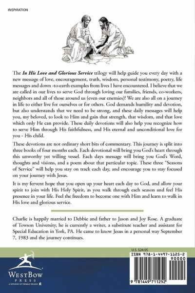 The In His Love and Glorious Service trilogy will help guide you every day with a new message of love, encouragement, truth, wisdom, personal testimony, poetry, life messages and down -to-earth examples from lives I have encountered. I believe that we are called in our lives to serve God through loving our families, friends, co-workers, neighbors and all of those around us (even our enemies)! We are also all on a journey in life to either live for ourselves or for others. God demands humility and devotion, but also understands that we need to be strong, and these daily messages will help you, my beloved, to look to Him and gain that strength, that wisdom, and that love which only He can provide. These daily devotions will also help you recognize how to serve Him through His faithfulness, and His eternal and unconditional love for you - His child. These devotions are not ordinary short bits of commentary. This journey is split into three books of four months each. Each devotional will bring you God's heart through this unworthy yet willing vessel. Each days message will bring you God's Word, thoughts and visions, and a poem about that particular topic. These three "Seasons of Service" will help you stay on track each day, and encourage you to stay focused on your journey with Jesus. It is my fervent hope that you open up your heart each day to God, and allow your spirit to join with His Holy Spirit, as you walk through each season and feel His presence in your life. Feel the freedom to become one with Him and learn to walk in His love and glorious service.