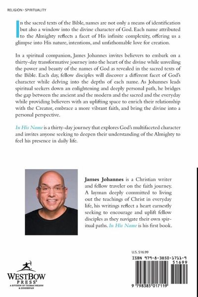 In the sacred texts of the Bible, names are not only a means of identification but also a window into the divine character of God. Each name attributed to the Almighty reflects a facet of His infinite complexity, offering us a glimpse into His nature, intentions, and unfathomable love for creation. In a spiritual companion, James Johannes invites believers to embark on a thirty-day transformative journey into the heart of the divine while unveiling the power and beauty of the names of God as revealed in the sacred texts of the Bible. Each day, fellow disciples will discover a different facet of God's character while delving into the depths of each name. As Johannes leads spiritual seekers down an enlightening and deeply personal path, he bridges the gap between the ancient and the modern and the sacred and the everyday while providing believers with an uplifting space to enrich their relationship with the Creator, embrace a more vibrant faith, and bring the divine into a personal perspective. In His Name is a thirty-day journey that explores God's multifaceted character and invites anyone seeking to deepen their understanding of the Almighty to feel his presence in daily life.