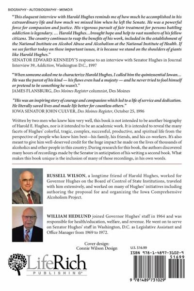 Written by two men who knew him very well, this book is not intended to be another biography of Harold E. Hughes. Nor is it intended to be an academic work. It is intended to reveal the many facets of Hughes' colorful, tragic, complex, successful, productive, and spiritual life from the perspective of people who knew him best-his family, his friends and his co-workers. It's also meant to give him well-deserved credit for the huge impact he made on the lives of thousands of alcoholics and other people in this country. During research for this wook, the authors discovered many hours of recordings made by the senator in anticipation of his writing a second book. What makes this book unique is the inclusion of many of those recordings, in his own words.