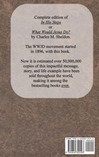 Complete edition of In His Steps: What Would Jesus Do? by Charles M. Sheldon. The WWJD movement started in 1896, with this book. Now it is estimated over 50,000,000 copies of this impactful message, story, and life example have been sold throughout the world, making it among the bestselling books ever. Broken into 31 short chapters, it follows various people, of different class and profession, after taking the pledge to ask themselves, "What would Jesus do?" The results are emotional and surprising. All students of thought should get this historic book. This edition is provided in a slim volume with full text at an affordable price.
